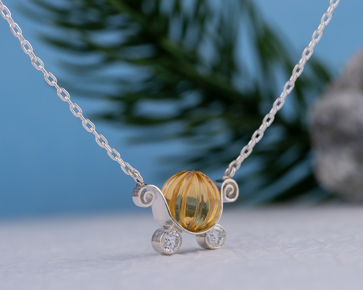 When we heard that RCTC was going to be performing Cinderella at their next event, the creative ideas immediately started flowing. We eventually settled on a simple, hand-fabricated pumpkin carriage necklace. This iconic design would be both the perfect symbol for the production and a great way for patrons to show their support. At the center of the piece is a beautifully carved, orange citrine bead serving as our pumpkin. The citrine is cradled by a hand fabricated carriage piece made from sterling silver. Finally, the entire piece sits on top of two, high quality round brilliant diamond “wheels” bezel set in matching silver settings.