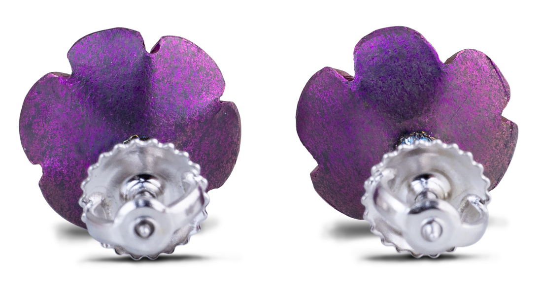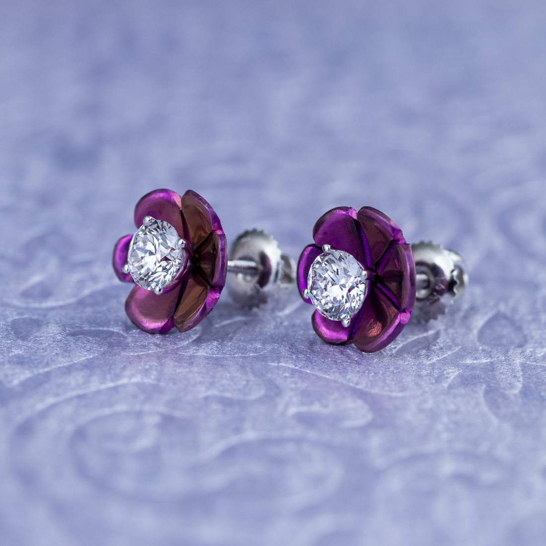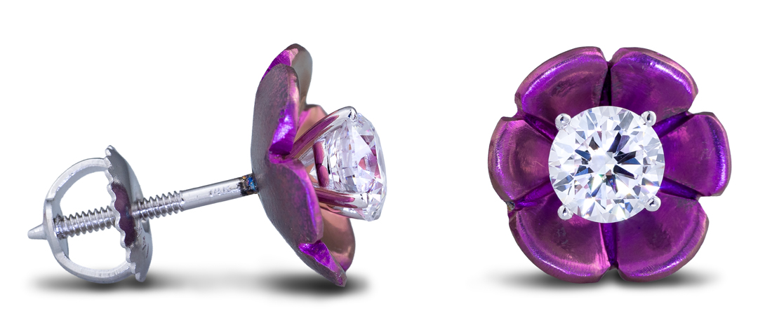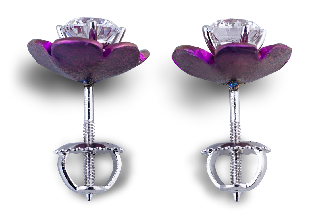 Add a splash of color to your look with these fun, lab grown diamond earrings. The brightly colored, iridescent lotus flowers are handcrafted from high grade titanium. This special material allows us to create the eye-catching magenta color that you see. With one carat of total diamond weight, these studs are the prefect size to go with any look. They come set in four prong, 14k white gold martini settings with threaded earring posts and backs. These video-call worthy earrings make a great gift.