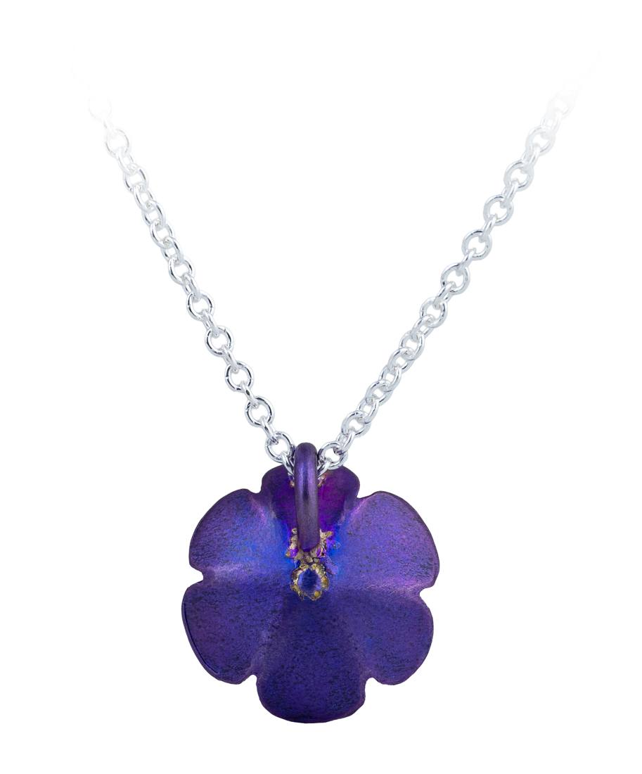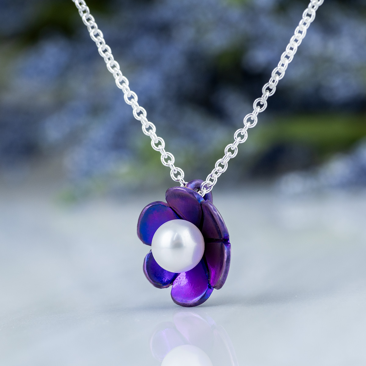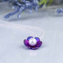 This beautiful pearl necklace is at once demure and striking. It features a stunningly vibrant, iridescent purple lotus flower handcrafted from high grade titanium. This special material allows us to create the gorgeous colors that you see here. Nestled in the center of the blossom is a perfectly proportioned, round white Akoya pearl. The entire pendant is suspended on a white gold, sterling silver cable chain (18in long). This necklace makes a great gift (or a treat for yourself) and is perfect for that special evening out.